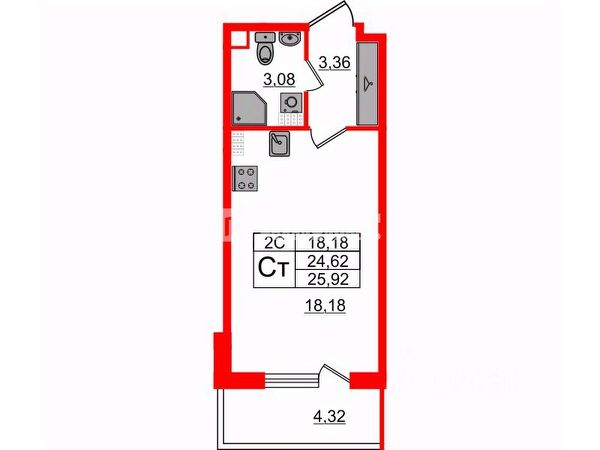 Общая площадь: 22.6кв.м.+лоджия 4кв.м