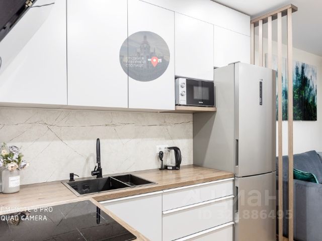 Зона кухни расположена на пьедестале (1 ступенька вверх), оборудована всей необходимой и премиальной техникой.