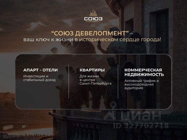 Работающий отель - деньги с 1 месяца! . Доход до 120 000 в месяц Скидка до 1,5 млн при покупке в Феврале 2026 года. __________ Уникальные редевеломпент объекты в центре Санкт-Петербурга! __________ Продажа квартиры Студии Номер квартиры: 51Н Этаж: 4 Количество комнат: Студия Общая площадь: 19 Тип комнат: Изолированные __________ Союз Девелопмент - ваш ключ к жизни в историческом сердце города! Более 20 объектов, прошедших реновацию (апарт-отели, ЖК, коммерческие помещения) Опыт в девелопменте с 2022 года Подрядные работы для внешних инвесторов Что мы предлагаем? Сочетание истории и современности - аккуратно сохраняем старые детали квартир, добавляя к ним технологии и стильный дизайн. Комфорт и удобство - проекты расположены в центральных районах, что делает их идеальными для жизни Индивидуальный подход - учитываем каждое ваше пожелание, чтобы создать пространство, которое станет вашим домом мечты. Выгодные вложения - объекты культурного наследия всегда в цене. Инвестируя сегодня, вы закладываете основу для будущего роста капитала. Надежность - опыт работы с 2022 года, статус надежный партнер для инвесторов и жильцов. __________ Звоните или пишите прямо СЕЙЧАС - не упустите возможность стать владельцем квартиры, которая станет вашей гордостью и надежной инвестицией!
