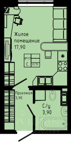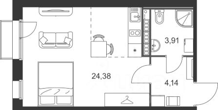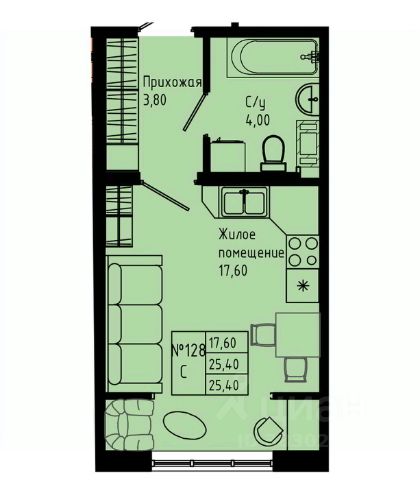 Квартира-студия с натяжными потолками, общей площадью 25,1м², жилая площадь 18,29м², прихожая - 3,80м², санузел - 3,25м²