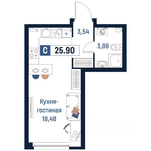 Общая площадь квартиры составляет 23,7 кв.м., (без балкона!).