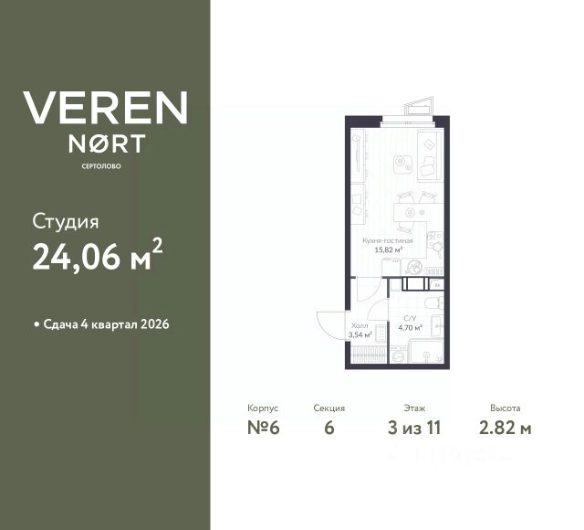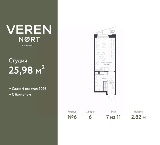 Продаётся студия в строящемся доме (Корпус 7.7), срок сдачи: IV-кв. 2025, общей площадью 27.82 кв.м., на 3 этаже. ЖК расположен в Сертолово, мкр.Черная речка. 25 минут на машине до метро Парнас, либо 30 минут до метро Пр.Просвещения.