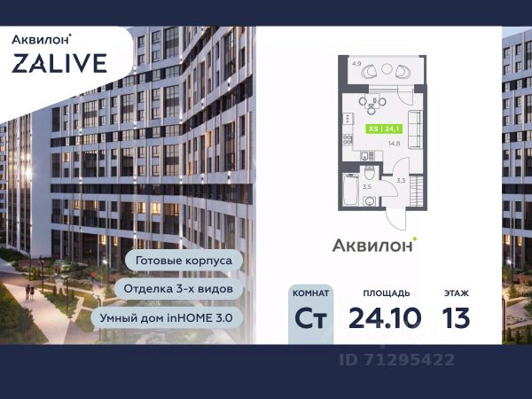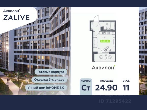 1-комн. квартира-студия от застройщика с предчистовой отделкой в ЖК "Аквилон ZALIVE" на 13 этаже. Общая площадь: 34.2 кв.м., площадь гостиной 5 кв.м., из которых 5 кв.м. выделено под кухонную зону. Высота потолков 2.7 м. Дом монолитный, многоподъездный, высотой 13 этажей. Квартира находится в 1-й секции в корпусе 12. На этаже 12 квартир. В подъезде 1 пассажирский и 1 грузовой лифт. Строительство завершено, дом сдан в 4 квартале 2023 года. Оформление сделки по договору купли-продажи. Отделка В квартире выполнена предчистовая отделка WhiteBox +Возможен дозаказ отделки в любом из 3 цветов: SAND, TERRA, GRAPHITE Отделка входит в стоимость квартиры в ДДУ ЖК "Аквилон ZALIVE" Жилой комплекс "Аквилон ZALIVE" расположился в уникальной части престижного Васильевского острова. С одной стороны рядом деловой и исторический центр, с другой берег Финского залива и новая современная инфраструктура в пешей доступности. Проект включает в себя пять тринадцатиэтажных "умных" домов в едином архитектурном стиле. Насыщенная социальная инфраструктура, инновации в каждой квартире, стильное благоустройство территории и видовые характеристики это лишь часть уникальных преимуществ жилого комплекса "Аквилон ZALIVE". -Малошумные лифты -Сквозные парадные -Светопрозрачные входные группы -Школа во дворе -Безбарьерная среда -Паркинг Стандарты Группы Аквилон для вашей комфортной жизни Thermo-S экономия на коммунальных платежах за счет дополнительно утепленных стен, кровли и цоколя. Энергоэффективные окна с селективным покрытием и аргоновым заполнением Soundstop - дополнительная шумоизоляция внутренних перегородок и межэтажных перекрытий, шумозащитные окна, малошумные лифты Light-in - в квартирах устанавливаются широкоформатные окна, увеличены на 30%. Высота подоконников на уровне 60 см от пола. Vent-in - в каждой комнате есть клапаны индивидуальной вентиляции, которые обеспечивают приток свежего воздуха с улицы. inHOME умный дом в каждой квартире Интеллектуальная цифровая система, которая позволит дистанционно решать бытовые вопросы, управлять квартирой и экономить на оплате коммунальных услуг. В состав inHOME входят: IP-домофон, Face key, "умные" счетчики, датчики протечки, дистанционное отключение розеток, и т.д. Двор ваш личный парк Для разработки проекта благоустройства и озеленения Группа Аквилон привлекла студию DEREVO PARK, которую ассоциация ландшафтных архитекторов России четыре года подряд признавала лучшей. Два хвойных сада, расположенные вдоль западной стороны квартала, станут визитной карточкой ЖК "Аквилон ZALIVE". Локация и инфраструктура Васильевский остров это море и прогулки, Санкт-Петербургский Государственный Университет и Ростральные колонны, музей современного искусства "Эрарта" и концептуальное пространство "Севкабель Порт". Достаточно переехать через мост и вот вы уже в центре или на Петроградской стороне. - 7 мин. до развязки ЗСД -12 мин. до м. Приморская -15 мин. до м. Невский проспект.