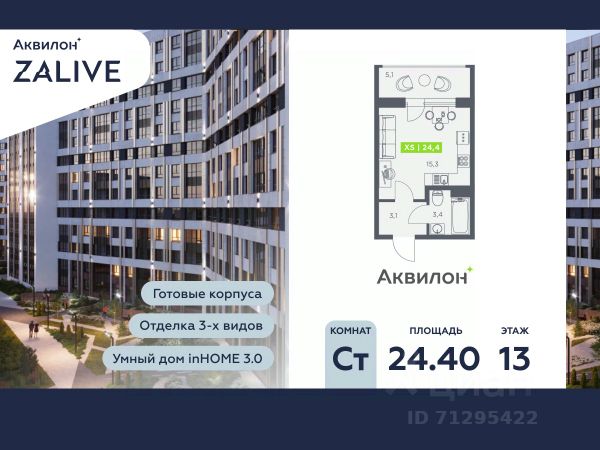 Купи квартиру в ЖК "Аквилон ZALIVE"! Отделка В квартире выполнена предчистовая отделка WhiteBox +Возможен дозаказ отделки в любом из 3 цветов: SAND, TERRA, GRAPHITE Отделка входит в стоимость квартиры в ДДУ ЖК "Аквилон ZALIVE" Жилой комплекс "Аквилон ZALIVE" расположился в уникальной части престижного Васильевского острова. С одной стороны рядом деловой и исторический центр, с другой берег Финского залива и новая современная инфраструктура в пешей доступности. Проект включает в себя пять тринадцатиэтажных "умных" домов в едином архитектурном стиле. Насыщенная социальная инфраструктура, инновации в каждой квартире, стильное благоустройство территории и видовые характеристики это лишь часть уникальных преимуществ жилого комплекса "Аквилон ZALIVE". -Малошумные лифты -Сквозные парадные -Светопрозрачные входные группы -Школа во дворе -Безбарьерная среда -Паркинг Стандарты Группы Аквилон для вашей комфортной жизни Thermo-S экономия на коммунальных платежах за счет дополнительно утепленных стен, кровли и цоколя. Энергоэффективные окна с селективным покрытием и аргоновым заполнением Soundstop - дополнительная шумоизоляция внутренних перегородок и межэтажных перекрытий, шумозащитные окна, малошумные лифты Light-in - в квартирах устанавливаются широкоформатные окна, увеличены на 30%. Высота подоконников на уровне 60 см от пола. Vent-in - в каждой комнате есть клапаны индивидуальной вентиляции, которые обеспечивают приток свежего воздуха с улицы. inHOME умный дом в каждой квартире Интеллектуальная цифровая система, которая позволит дистанционно решать бытовые вопросы, управлять квартирой и экономить на оплате коммунальных услуг. В состав inHOME входят: IP-домофон, Face key, "умные" счетчики, датчики протечки, дистанционное отключение розеток, и т.д. Двор ваш личный парк Для разработки проекта благоустройства и озеленения Группа Аквилон привлекла студию DEREVO PARK, которую ассоциация ландшафтных архитекторов России четыре года подряд признавала лучшей. Два хвойных сада, расположенные вдоль западной стороны квартала, станут визитной карточкой ЖК "Аквилон ZALIVE". Локация и инфраструктура Васильевский остров это море и прогулки, Санкт-Петербургский Государственный Университет и Ростральные колонны, музей современного искусства "Эрарта" и концептуальное пространство "Севкабель Порт". Достаточно переехать через мост и вот вы уже в центре или на Петроградской стороне. - 7 мин. до развязки ЗСД -12 мин. до м. Приморская -15 мин. до м. Невский проспект #ZWSCtv