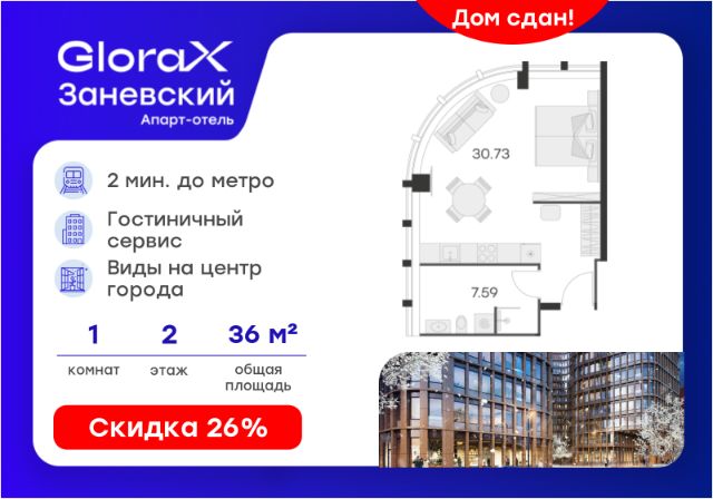 Продается апартамент-студия на 13-м этаже в сданном Апарт-комплексе бизнес-класса "GloraX Заневский". Ключи сразу! Общая площадь лота составляет 29,77 кв. м, из которых 24,84 кв. м отведено под жилую. Номер апартамента - 1 306. Преимущества: - Полная чистовая отделка - Возможность покупки меблировка и техника - Вход по ключ-карте - Прачечная на 1 этаже - Возможность дозаказа отельного сервиса - Программы доходности - Летний бар и променад - Воркаут площадка - Pet-friendly Апартаменты "GloraX Заневский" - проект бизнес-класса с развитой инфраструктурой, удовлетворяющей все потребности самых взыскательных гостей. Располагается в одном из наиболее перспективных, районов Петербурга в 2х минутах от метро "Ладожская" и в 10 минутах от Невского проспекта. В "GloraX Заневский" есть все, что необходимо для комфортной жизни, работы и отдыха. Инфраструктура, покрывающая все потребности и ожидания собственников и арендаторов. В радиусе 150 метров находятся супермаркеты с возможностью доставки продуктов прямо до дверей апартаментов. На 1000 кв. м. общественных пространств расположится уютный лобби-бар, ресторан мировой кухни на 80 человек и оборудованные коворкинги. В апартаментах "GloraX Заневский" выполнена современная отделка с использованием высококачественных экологичных материалов. В проекте предусмотрен подземный отапливаемый паркинг на 100 мест, куда можно спуститься на лифте прямо от дверей апартаментов. Узнайте подробности в Отделе продаж. квартира-студия в готовой новостройке в районе Красногвардейский в Санкт-Петербурге.