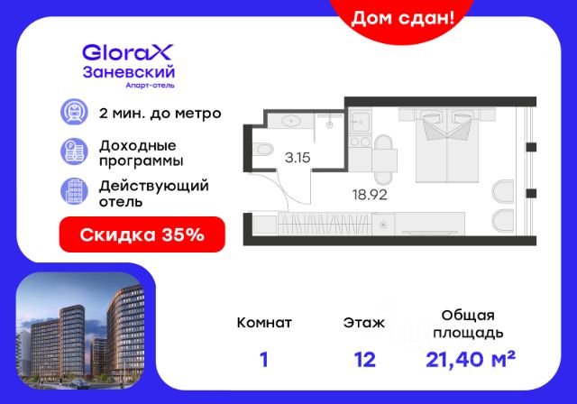Продается апартамент-студия на 13-м этаже в сданном Апарт-комплексе бизнес-класса "GloraX Заневский". Ключи сразу! Общая площадь лота составляет 22,07 кв. м, из которых 18,92 кв. м отведено под жилую. Номер апартамента - 1 343. Преимущества: - Полная чистовая отделка - Возможность покупки меблировка и техника - Вход по ключ-карте - Прачечная на 1 этаже - Возможность дозаказа отельного сервиса - Программы доходности - Летний бар и променад - Воркаут площадка - Pet-friendly Апартаменты "GloraX Заневский" - проект бизнес-класса с развитой инфраструктурой, удовлетворяющей все потребности самых взыскательных гостей. Располагается в одном из наиболее перспективных, районов Петербурга в 2х минутах от метро "Ладожская" и в 10 минутах от Невского проспекта. В "GloraX Заневский" есть все, что необходимо для комфортной жизни, работы и отдыха. Инфраструктура, покрывающая все потребности и ожидания собственников и арендаторов. В радиусе 150 метров находятся супермаркеты с возможностью доставки продуктов прямо до дверей апартаментов. На 1000 кв. м. общественных пространств расположится уютный лобби-бар, ресторан мировой кухни на 80 человек и оборудованные коворкинги. В апартаментах "GloraX Заневский" выполнена современная отделка с использованием высококачественных экологичных материалов. В проекте предусмотрен подземный отапливаемый паркинг на 100 мест, куда можно спуститься на лифте прямо от дверей апартаментов. Цена указана при 100% оплате или стандартной ипотеке. Узнайте подробности в Отделе продаж. Купить квартиру-студию в готовой новостройке рядом с метро Ладожская.