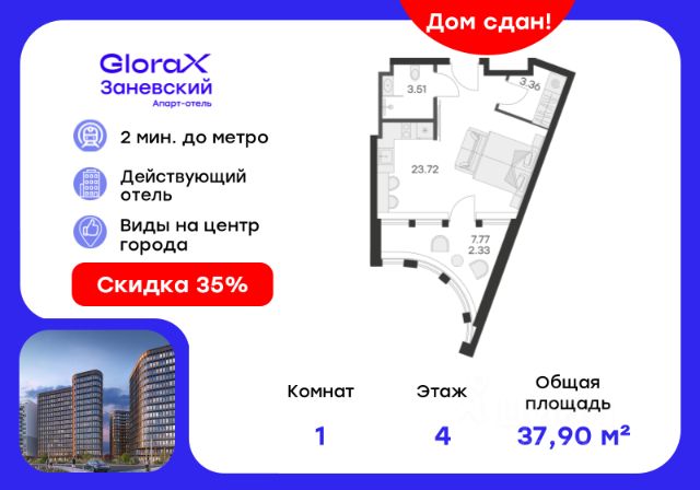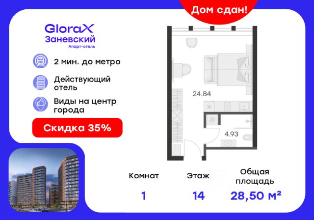 Продается апартамент-студия на 14-м этаже в сданном Апарт-комплексе бизнес-класса "GloraX Заневский". Ключи сразу! Общая площадь лота составляет 28,38 кв. м, из которых 23,63 кв. м отведено под жилую. Номер апартамента - 1 423. Преимущества: - Полная чистовая отделка - Возможность покупки меблировка и техника - Вход по ключ-карте - Прачечная на 1 этаже - Возможность дозаказа отельного сервиса - Программы доходности - Летний бар и променад - Воркаут площадка - Pet-friendly Апартаменты "GloraX Заневский" - проект бизнес-класса с развитой инфраструктурой, удовлетворяющей все потребности самых взыскательных гостей. Располагается в одном из наиболее перспективных, районов Петербурга в 2х минутах от метро "Ладожская" и в 10 минутах от Невского проспекта. В "GloraX Заневский" есть все, что необходимо для комфортной жизни, работы и отдыха. Инфраструктура, покрывающая все потребности и ожидания собственников и арендаторов. В радиусе 150 метров находятся супермаркеты с возможностью доставки продуктов прямо до дверей апартаментов. На 1000 кв. м. общественных пространств расположится уютный лобби-бар, ресторан мировой кухни на 80 человек и оборудованные коворкинги. В апартаментах "GloraX Заневский" выполнена современная отделка с использованием высококачественных экологичных материалов. В проекте предусмотрен подземный отапливаемый паркинг на 100 мест, куда можно спуститься на лифте прямо от дверей апартаментов. Узнайте подробности в Отделе продаж. квартира-студия в готовой новостройке рядом с метро Новочеркасская.