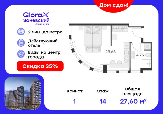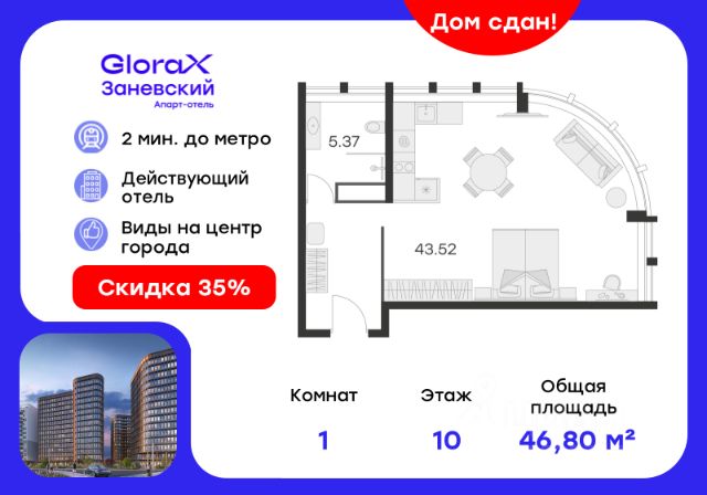 Продается апартамент-студия на 13-м этаже в сданном Апарт-комплексе бизнес-класса "GloraX Заневский". Ключи сразу! Общая площадь лота составляет 22,07 кв. м, из которых 18,92 кв. м отведено под жилую. Номер апартамента - 1 343. Преимущества: - Полная чистовая отделка - Возможность покупки меблировка и техника - Вход по ключ-карте - Прачечная на 1 этаже - Возможность дозаказа отельного сервиса - Программы доходности - Летний бар и променад - Воркаут площадка - Pet-friendly Апартаменты "GloraX Заневский" - проект бизнес-класса с развитой инфраструктурой, удовлетворяющей все потребности самых взыскательных гостей. Располагается в одном из наиболее перспективных, районов Петербурга в 2х минутах от метро "Ладожская" и в 10 минутах от Невского проспекта. В "GloraX Заневский" есть все, что необходимо для комфортной жизни, работы и отдыха. Инфраструктура, покрывающая все потребности и ожидания собственников и арендаторов. В радиусе 150 метров находятся супермаркеты с возможностью доставки продуктов прямо до дверей апартаментов. На 1000 кв. м. общественных пространств расположится уютный лобби-бар, ресторан мировой кухни на 80 человек и оборудованные коворкинги. В апартаментах "GloraX Заневский" выполнена современная отделка с использованием высококачественных экологичных материалов. В проекте предусмотрен подземный отапливаемый паркинг на 100 мест, куда можно спуститься на лифте прямо от дверей апартаментов. Цена указана при 100% оплате или стандартной ипотеке. Узнайте подробности в Отделе продаж.