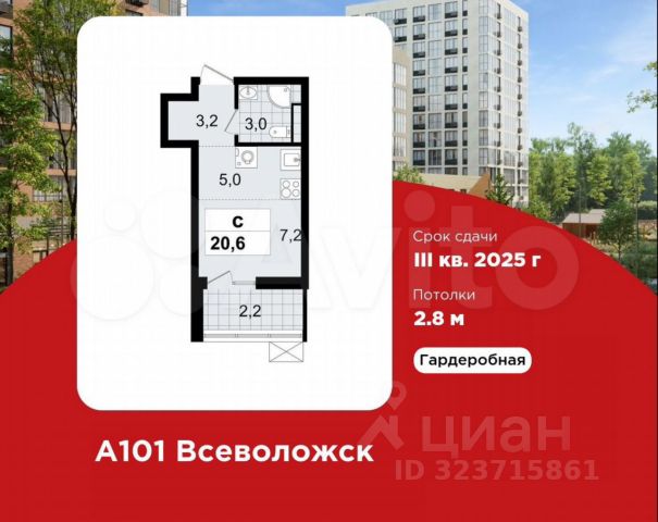 Студия площадью 20.60 в ЖК "А101 Всеволожск" c лоджией на 9 этаже. Квартира white box. Вид из окна во двор. В квартире 1 санузел. Высота потолков 2.8 м. Особенность планировки - гардеробная. Предложения от застройщика на ноябрь 2025: - Гибкая рассрочка 20 000 руб/мес. и первым взносом 10%. ОТДЕЛКА Квартира с предчистовой отделкой предполагает: качественную стяжку на полах под финишное покрытие, потолок с обеспыливающей грунтовкой белого цвета, ровные стены с покрытием штукатурка. Выполнены все работы по проведению электрики. На все отделочные работы от застройщика предоставляется гарантия. Если вы хотите дозаказать дизайнерскую отделку, обращайтесь к нашими специалистами. ОСОБЕННОСТИ ПЛАНИРОВКИ Гардеробная позволяет не только удобно разместить все вещи, но и идеально подходит для хранения крупных предметов. ПАРАДНАЯ В каждой парадной предусмотрены места для хранения велосипедов и колясок, гостевой санузел, лапамойка (место для мытья домашних животных или колес велосипедов) и удобная зона ожидания для гостей. ДВОРЫ И ОКРУЖЕНИЕ Просторные дворы свободны от машин и закрыты от посторонних. Большую часть комплекса займут благоустроенные зелёные зоны, теневые сады и городские общественные пространства с развитой тротуарной сетью и велодорожками. Каждый дом оборудован системами видеонаблюдения и контроля доступа. Не хватает средств на покупку кладового помещения? Оформите ипотеку на квартиру и добавьте к ней часть стоимости кладовой. ЗАСТРОЙЩИК ГК "А101" - крупный инвестиционно-строительный холдинг, занимает 6-е место по объему строительства в России (по данным "Единого ресурса застройщиков" на 2023 год). НКР присвоило ГК "А101" кредитный рейтинг A+.ru, подтверждая его надежность и финансовую устойчивость для завершения строительства ЖК. Купить квартиру-студию в готовой новостройке рядом с метро Улица Дыбенко.