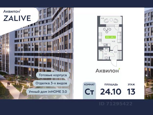 Купи квартиру в ЖК "Аквилон ZALIVE"! Отделка В квартире выполнена предчистовая отделка WhiteBox +Возможен дозаказ отделки в любом из 3 цветов: SAND, TERRA, GRAPHITE Отделка входит в стоимость квартиры в ДДУ ЖК "Аквилон ZALIVE" Жилой комплекс "Аквилон ZALIVE" расположился в уникальной части престижного Васильевского острова. С одной стороны рядом деловой и исторический центр, с другой берег Финского залива и новая современная инфраструктура в пешей доступности. Проект включает в себя пять тринадцатиэтажных "умных" домов в едином архитектурном стиле. Насыщенная социальная инфраструктура, инновации в каждой квартире, стильное благоустройство территории и видовые характеристики это лишь часть уникальных преимуществ жилого комплекса "Аквилон ZALIVE". -Малошумные лифты -Сквозные парадные -Светопрозрачные входные группы -Школа во дворе -Безбарьерная среда -Паркинг Стандарты Группы Аквилон для вашей комфортной жизни Thermo-S экономия на коммунальных платежах за счет дополнительно утепленных стен, кровли и цоколя. Энергоэффективные окна с селективным покрытием и аргоновым заполнением Soundstop - дополнительная шумоизоляция внутренних перегородок и межэтажных перекрытий, шумозащитные окна, малошумные лифты Light-in - в квартирах устанавливаются широкоформатные окна, увеличены на 30%. Высота подоконников на уровне 60 см от пола. Vent-in - в каждой комнате есть клапаны индивидуальной вентиляции, которые обеспечивают приток свежего воздуха с улицы. inHOME умный дом в каждой квартире Интеллектуальная цифровая система, которая позволит дистанционно решать бытовые вопросы, управлять квартирой и экономить на оплате коммунальных услуг. В состав inHOME входят: IP-домофон, Face key, "умные" счетчики, датчики протечки, дистанционное отключение розеток, и т.д. Двор ваш личный парк Для разработки проекта благоустройства и озеленения Группа Аквилон привлекла студию DEREVO PARK, которую ассоциация ландшафтных архитекторов России четыре года подряд признавала лучшей. Два хвойных сада, расположенные вдоль западной стороны квартала, станут визитной карточкой ЖК "Аквилон ZALIVE". Локация и инфраструктура Васильевский остров это море и прогулки, Санкт-Петербургский Государственный Университет и Ростральные колонны, музей современного искусства "Эрарта" и концептуальное пространство "Севкабель Порт". Достаточно переехать через мост и вот вы уже в центре или на Петроградской стороне. - 7 мин. до развязки ЗСД -12 мин. до м. Приморская -15 мин. до м. Невский проспект #2w5bFb Купить квартиру-студию в готовой новостройке в округе Гавань в Санкт-Петербурге.