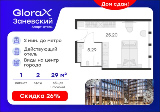 Продается апартамент-студия на 14-м этаже в сданном Апарт-комплексе бизнес-класса "GloraX Заневский". Ключи сразу! Общая площадь лота составляет 29,94 кв. м, из которых 25,01 кв. м отведено под жилую. Номер апартамента - 1 446. Преимущества: - Полная чистовая отделка - Возможность покупки меблировка и техника - Вход по ключ-карте - Прачечная на 1 этаже - Возможность дозаказа отельного сервиса - Программы доходности - Летний бар и променад - Воркаут площадка - Pet-friendly Апартаменты "GloraX Заневский" - проект бизнес-класса с развитой инфраструктурой, удовлетворяющей все потребности самых взыскательных гостей. Располагается в одном из наиболее перспективных, районов Петербурга в 2х минутах от метро "Ладожская" и в 10 минутах от Невского проспекта. В "GloraX Заневский" есть все, что необходимо для комфортной жизни, работы и отдыха. Инфраструктура, покрывающая все потребности и ожидания собственников и арендаторов. В радиусе 150 метров находятся супермаркеты с возможностью доставки продуктов прямо до дверей апартаментов. На 1000 кв. м. общественных пространств расположится уютный лобби-бар, ресторан мировой кухни на 80 человек и оборудованные коворкинги. В апартаментах "GloraX Заневский" выполнена современная отделка с использованием высококачественных экологичных материалов. В проекте предусмотрен подземный отапливаемый паркинг на 100 мест, куда можно спуститься на лифте прямо от дверей апартаментов. Узнайте подробности в Отделе продаж.
