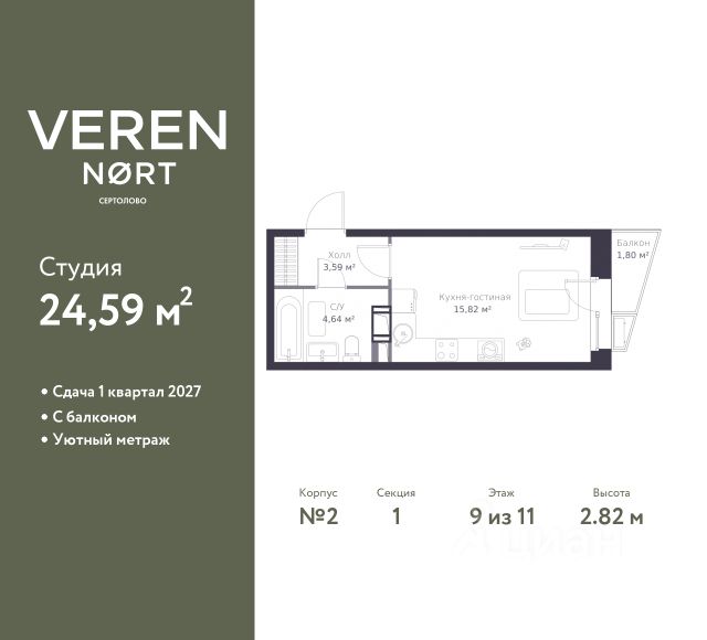 Успейте оформить бронирование по этой цене! Предложение ограничено! Стоимость квартиры указана со скидкой, ваша экономия составит 1,216,341 RUB. Информация по телефону, наши менеджеры вам все расскажут! Однокомнатная квартира-студия в Veren Nort Сертолово на 7 этаже. Квартира без отделки, полностью готова к чистовой отделке и дальнейшему ремонту. Общая площадь: 27.02 кв.м., площадь гостиной 16.49 кв.м., из которых 3 кв.м. выделено под кухонную зону. Все окна выходят на одну сторону. В квартире один балкон, один совмещенный санузел. Высота потолков 2.82 м. Квартира находится в корпусе 4. Дом монолитный, одноподъездный, высотой 11 этажей. На этаже 14 квартир. В подъезде 1 пассажирский и 1 грузовой лифт. Начало строительства - 3 квартал 2023 года. Окончание строительства - 4 квартал 2025 года. Оформление сделки по договору долевого участия. С балконом, вид на приватный двор. Сочетание современной архитектуры и отличной экологии севера Лен. области. Выразительный облик домов разработан именитым архитектурным бюро "Остоженка". Характеристики жилого комплекса исключительны: продуманный ландшафтный дизайн, оригинальные парадные, разработанные по индивидуальному дизайн-проекту, современные детские и многофункциональные спортивные площадки, летний кинотеатр под открытым небом, два детских сада. Комплекс создается в уже сложившейся инфраструктуре г. Сертолово и обладает удобным транспортным сообщением с Санкт-Петербургом. В 300 метрах от "VEREN NORT сертолово" планируется транспортно-пересадочный узел "Сертолово", который обеспечит удобную железнодорожную связь с Финляндским вокзалом Санкт-Петербурга. #z3D8Fd Продам квартиру-студию в ипотеку в новостройке в Сертолово.