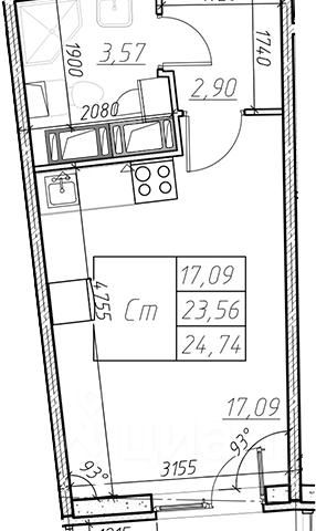 Общая площадь квартиры - 24.96 кв. м. , высота потолка 2,77 м.