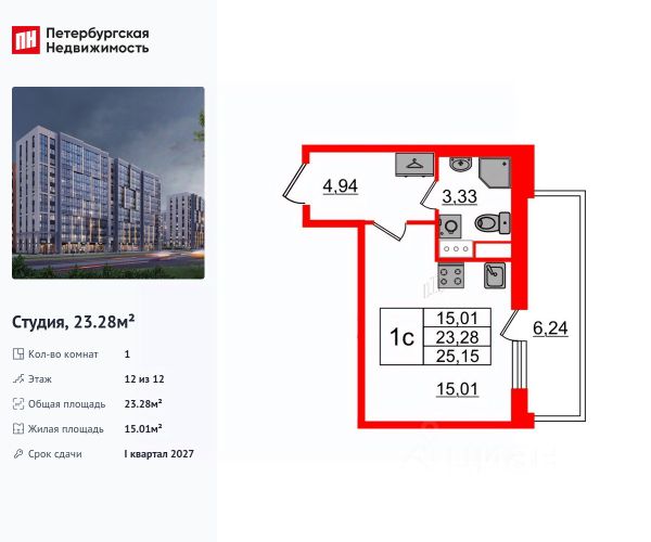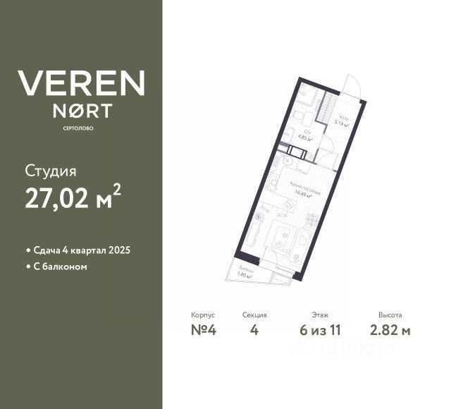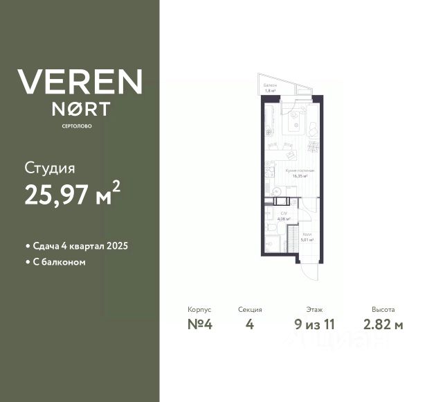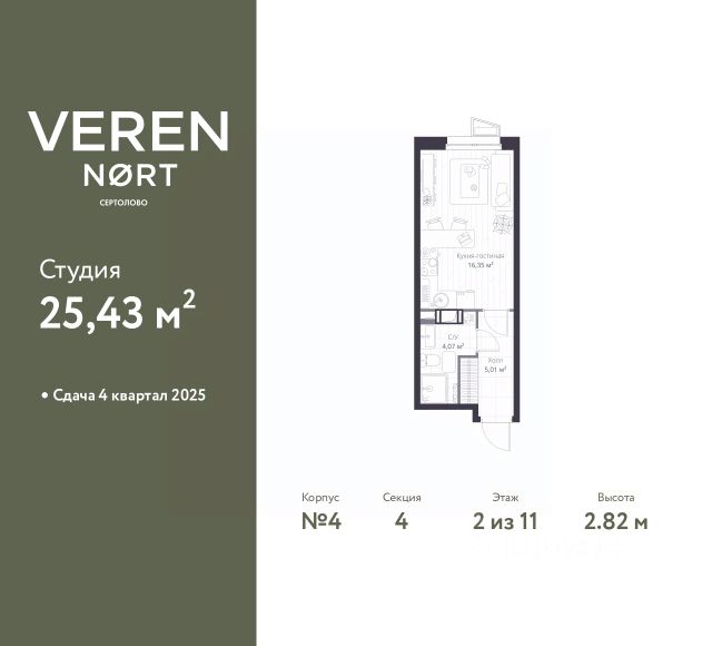 Успейте оформить бронирование на этих условиях! Срок акции ограничен! Стоимость квартиры указана со скидкой, ваша экономия составит 1,100,724 RUB. По всем вопросам обращайтесь в офис продаж, мы вам все подробно расскажем! 1-комн. квартира-студия от застройщика в Veren Nort Сертолово на 2 этаже. Квартира без отделки, после выдачи ключей можно делать ремонт. Общая площадь: 25.43 кв.м., площадь гостиной 16.34 кв.м., из которых 3 кв.м. выделено под кухонную зону. Все окна выходят на одну сторону. В квартире один совмещенный санузел. Высота потолков 2.82 м. Квартира находится в корпусе 4. Дом монолитный, одноподъездный, высотой 11 этажей. На этаже 14 квартир. В подъезде 1 пассажирский и 1 грузовой лифт. Начало строительства - 3 квартал 2023 года. Окончание строительства - 4 квартал 2025 года. Оформление сделки по договору долевого участия. Вид на приватный двор. Сочетание современной архитектуры и отличной экологии севера Лен. области. Выразительный облик домов разработан именитым архитектурным бюро "Остоженка". Характеристики жилого комплекса исключительны: продуманный ландшафтный дизайн, оригинальные парадные, разработанные по индивидуальному дизайн-проекту, современные детские и многофункциональные спортивные площадки, летний кинотеатр под открытым небом, два детских сада. Комплекс создается в уже сложившейся инфраструктуре г. Сертолово и обладает удобным транспортным сообщением с Санкт-Петербургом. В 300 метрах от "VEREN NORT сертолово" планируется транспортно-пересадочный узел "Сертолово", который обеспечит удобную железнодорожную связь с Финляндским вокзалом Санкт-Петербурга. #zuWdsa Продается квартира-студия в ипотеку в новостройке рядом с метро Озерки.