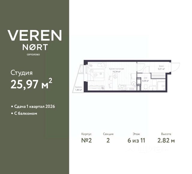 Успейте забронировать, пока действует скидка! Период акции ограничен! Стоимость квартиры указана со скидкой, ваша экономия составит 1,351,264 RUB. По всем вопросам обращайтесь в офис продаж, наши менеджеры вам все расскажут! 1-комн. квартира-студия от застройщика в Veren Nort Сертолово на 3 этаже. Квартира без отделки, полностью готова к ремонту. Общая площадь: 25.43 кв.м., площадь гостиной 16.34 кв.м., из которых 3 кв.м. выделено под кухонную зону. Все окна выходят на одну сторону. В квартире один совмещенный санузел. Высота потолков 2.82 м. Квартира находится в корпусе 4. Дом монолитный, одноподъездный, высотой 11 этажей. На этаже 14 квартир. В подъезде 1 пассажирский и 1 грузовой лифт. Начало строительства - 3 квартал 2023 года. Окончание строительства - 1 квартал 2026 года. Оформление сделки по договору долевого участия. Вид на приватный двор. Сочетание современной архитектуры и отличной экологии севера Лен. области. Выразительный облик домов разработан именитым архитектурным бюро "Остоженка". Характеристики жилого комплекса исключительны: продуманный ландшафтный дизайн, оригинальные парадные, разработанные по индивидуальному дизайн-проекту, современные детские и многофункциональные спортивные площадки, летний кинотеатр под открытым небом, два детских сада. Комплекс создается в уже сложившейся инфраструктуре г. Сертолово и обладает удобным транспортным сообщением с Санкт-Петербургом. В 300 метрах от "VEREN NORT сертолово" планируется транспортно-пересадочный узел "Сертолово", который обеспечит удобную железнодорожную связь с Финляндским вокзалом Санкт-Петербурга. #ZuWDl0