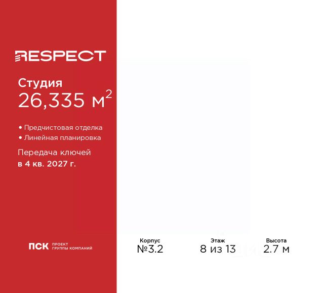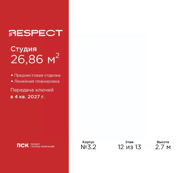 Продается однокомнатная квартира-студия с предчистовой отделкой в ЖК "RESPECT" на 10 этаже. Общая площадь: 32.8 кв.м., площадь гостиной 20.8 кв.м., из которых 5 кв.м. выделено под кухонную зону. Все окна выходят на одну сторону. В квартире один балкон, один совмещенный санузел. Высота потолков 2.7 м. Квартира будет сдана с отделкой WHITE BOX, в которую включены следующие виды работ: - заливка стяжки; - установлена система отопления квартиры; - подготовлены потолки; - все стены выровнены, загрунтованы и отштукатурены; - электрическая проводка разведена по комнатам. Квартира будет готова к чистовой отделке. Дом монолитный, многоподъездный, переменной этажности, от 10 до 13 этажей. Квартира находится в 1-й секции высотой 13 этажей в корпусе 3.2. На этаже 5 квартир. В подъезде 1 пассажирский и 1 грузовой лифт. Начало строительства - 3 квартал 2025 года. Окончание строительства - 4 квартал 2027 года. Оформление сделки по договору долевого участия. В шаговой доступности от жилого комплекса находятся станции метро (расстояние по прямой): "Лесная" (800 м), "Площадь Мужества" (1.4 км), "Выборгская" (1.9 км), также недалеко от этого корпуса расположены станции метро: "Академическая", "Политехническая". Квартал строится на Полюстровском пр, 87, в одной из самых востребованных локаций Петербурга. В 10 минутах пешком - метро "Лесная" и в 10 минутах на транспорте - Петроградская сторона. Высота домов от 7 до 13 этажей. На территории Respect строится школа на 1125 учащихся и детский сад на 240 мест. Запроектированы собственная газовая котельная, закрытая территория, дворы без машин и подземные паркинги с лифтами. Вентилируемые фасады облицованы клинкерным кирпичом. Дома из этого материала служат веками, являясь гордостью хозяев. Дизайн парадных зон и входных групп - сочетание лаконичности отделки и декоративных элементов с текстурами из натурального камня и дерева с приглушенной подсветкой теплым светом. Во входных группах расположены гостевые зоны с мягкой мебелью. Вся территория квартала будет связана единой концепцией благоустройства, разработанной ландшафтным бюро L.BURO. В основе - идея создания увлекательного ландшафтного пространства для насыщенной жизни, включающего в себя пейзажные зоны, современные архитектурные композиции, открытые террасы на стилобатах с зонами отдыха и парклетами, спортивными площадками. Это пространство для людей всех возрастов и различных увлечений. На эксплуатируемой кровле на уровне первого этажа в домах 1 и 4 будут обустроены общественные видовые террасы. В квартале запроектированы внутренние закрытые территории дворов домов без доступа автомобилей и безбарьерная среда для велосипедистов и колясок. Предусмотрены IP-домофония с функцией дистанционного открывания калиток и парадных, а также дистанционный сбор показаний счетчиков и мобильное приложение для жителей. Для безопасности жителей квартала - круглосуточное видеонаблюдение и служба охраны. В каждой квартире предусмотрены внешние корзины для конд Квартира-студия в ипотеку в новостройке рядом с метро Площадь Мужества.