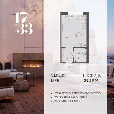 Апартамент 359 в Комплексе "17/33 Петровский остров" О проекте: Премиальный комплекс резиденций для истинных ценителей изысканной архитектуры, непревзойденного сервиса и необыкновенной панорамы Санкт-Петербурга. Уникальное расположение между Малой Невой и Петровским прудом подарит будущим резидентам неповторимое ощущение жизни на собственном уединенном острове. Уникальная локация. Проект расположен в объятьях главных островов Петербурга — Петроградской стороны, Васильевского и Крестовского, и в самой зеленой и выигрышной части Петровского — на первой линии Малой Невы, между величественной рекой и тихим Петровским прудом. До ключевых точек притяжения, любимых парков, шопинга и развлечений — пара минут на авто. 100% видовых апартаментов. Виды на Малую Невку, на Петровский пруд.; Проект разделен на три формата: Club, Life, Residence; 5-8 этажей; высота потолка до 7 метров; 1000 м2 общественных пространств; фитнес и СПА; кинозал и зал для семейных торжеств; коворкинг и детский клуб; лаундж с библиотекой; терраса площадью 120 м2 для резидентов; ELEMENT создает премиальные проекты в сфере недвижимости Санкт-Петербурга — с уникальными концепциями, продуманным наполнением и сервисом самого высокого уровня. Продается квартира-студия в ипотеку в новостройке в районе Петроградский в Санкт-Петербурге.