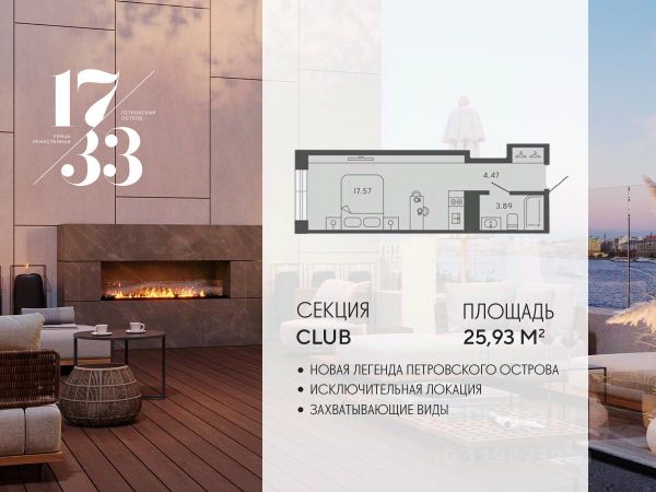 Сдаем в 2026 году! Апартамент 88 в Комплексе "17/33 Петровский остров" О проекте: Премиальный комплекс резиденций для истинных ценителей изысканной архитектуры, непревзойденного сервиса и необыкновенной панорамы Санкт-Петербурга. Уникальное расположение между Малой Невой и Петровским прудом подарит будущим резидентам неповторимое ощущение жизни на собственном уединенном острове. Уникальная локация. Проект расположен в объятьях главных островов Петербурга — Петроградской стороны, Васильевского и Крестовского, и в самой зеленой и выигрышной части Петровского — на первой линии Малой Невы, между величественной рекой и тихим Петровским прудом. До ключевых точек притяжения, любимых парков, шопинга и развлечений — пара минут на авто. 100% видовых апартаментов. Виды на Малую Невку, на Петровский пруд.; Проект разделен на три формата: Club, Life, Residence; 5-8 этажей; высота потолка до 7 метров; 1000 м2 общественных пространств; фитнес и СПА; кинозал и зал для семейных торжеств; коворкинг и детский клуб; лаундж с библиотекой; терраса площадью 120 м2 для резидентов; ELEMENT создаёт инновационные жилые и коммерческие объекты в Санкт-Петербурге и Москве, которые устанавливают новые стандарты эффективной жизни в мегаполисах. Продается квартира-студия в ипотеку в новостройке в районе Петроградский в Санкт-Петербурге.
