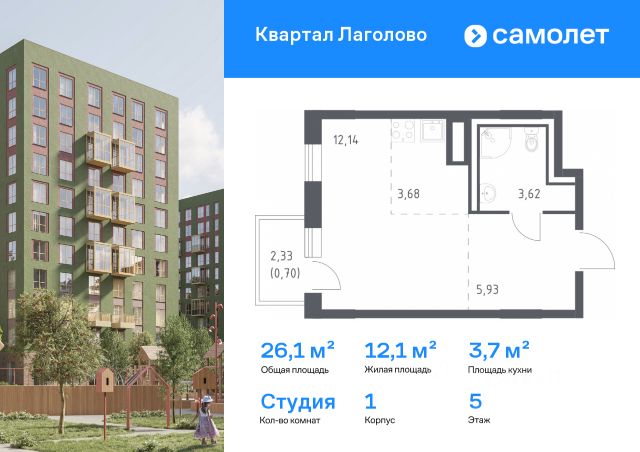 Старт продаж! Студия площадью 23.62 в ЖК "А101 Лаголово" на 3 этаже. Квартира без отделки. Вид из окна на улицу. В квартире 1 санузел. Высота потолков 2.74 м. Предложения от застройщика на декабрь 2025: - Гибкая рассрочка 20 000 руб/мес. и первым взносом 10%. ОТДЕЛКА Квартира передается без отделки. Благодаря тому, что в данном типе отделки стены не возводятся, вы сможете создать удобную планировку и самостоятельно организовать зонирование комнат. ПАРАДНАЯ. В каждой парадной предусмотрены места для хранения велосипедов и колясок, гостевой санузел и удобная зона ожидания для гостей. ДВОРЫ И ОКРУЖЕНИЕ. Просторные дворы безопасны для детей, так как свободны от машин, закрыты от посторонних и постоянно находятся под видеонаблюдением. Во дворах создается разнообразная среда для детей всех возрастов: детские площадки с батутами, тактильными дорожками и игровыми комплексами. Для активного отдыха - воркаут-площадки, столы для пинг-понга и газоны для занятий йогой. Во дворах есть и тихие уголки - зеленые гостиные с уличной мебелью, где можно поработать на свежем воздухе или отдохнуть в тишине. Из внутренних дворов комплекса можно выйти на пешеходный бульвар длиной около 900 метров. Здесь будет организовано полноценное общественное пространство с амфитеатром, уличным кафе, ручьем, фонтаном и множеством мест для отдыха и игр. Большую часть бульвара займут благоустроенные зеленые зоны и теневые сады из десятков видов деревьев и кустарников, многолетних цветов и трав, которые будут радовать глаз круглый год. "А101 Лаголово" - современный город у подножия знаменитых Дудерговских высот, в объятиях чистейших озер и зеленых живописных массивов, наполненный всем необходимым для счастливой жизни. ИНФРАСТРУКТУРА. Мы занимаемся комплексным освоением территории. Наш приоритет - доступность всех сервисов для счастливой жизни. 1. Лаголово-город 15-ти минутной доступности. Вся необходимая инфраструктура: магазины, салоны красоты, образовательные учреждения, медицинские центры находятся в 15-ти минутах пешей прогулки от любой точки жилого комплекса. Это позволяет не тратить время на долгие перемещения. 2. Представьте идеальный город, где ребенок может спокойно играть, а пожилой человек наслаждаться заслуженным отдыхом. Жилая среда нашего комплекса может комфортно использоваться как 8-летним ребенком, так и 80-летним пожилым человеком. Дома, улицы, общественные пространства, тротуары спроектированы с заботой о людях разных возрастов. 3. Мы активно развиваем авторскую образовательную экосистему "Лёрнити". Она включает строительство 8 современных детских садов (2000 мест) и 3 школ (2945 учащихся). Мы учим родителей гармонично общаться с детьми, помогаем малышам подготовиться к школе, а подросткам - выбрать будущую профессию и развить таланты. Не хватает средств на покупку кладового помещения? Оформите ипотеку на квартиру и добавьте к ней часть стоимости кладовой. ЗАСТРОЙЩИК ГК "А101" - крупный инвестиционно-строительный холдинг, занимает 6-е место по объему стр