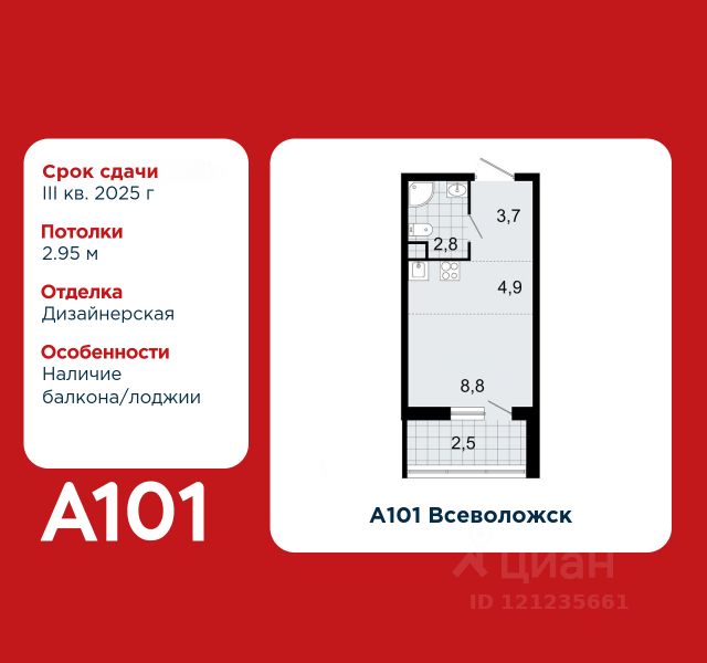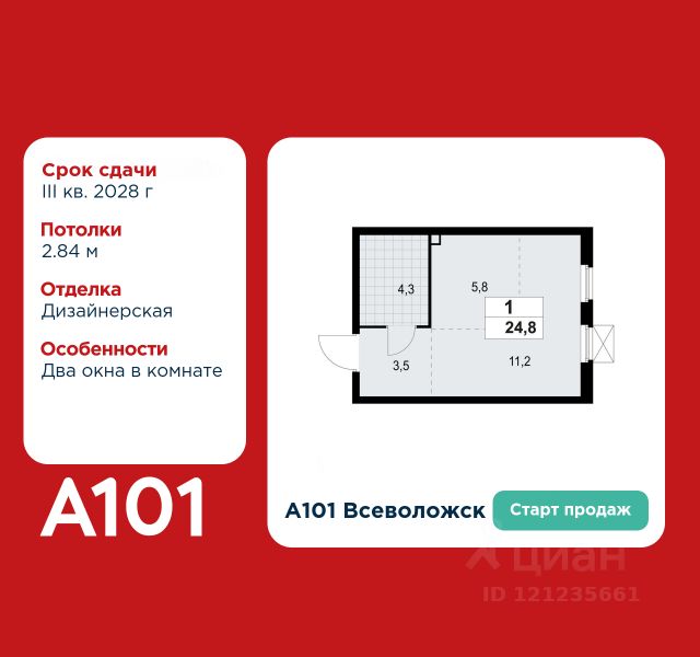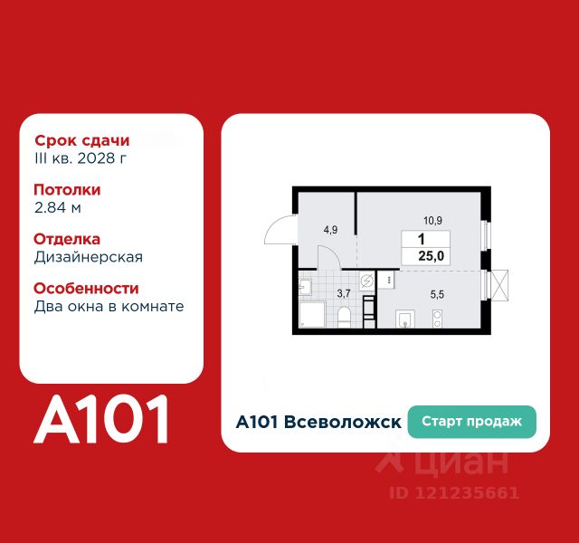 Старт продаж! Студия площадью 25.00 в ЖК "А101 Всеволожск" на 4 этаже. Квартира с отделкой. Вид из окна на улицу. В квартире 1 санузел. Высота потолков 2.84 м. Предложения от застройщика на декабрь 2025: - Гибкая рассрочка 20 000 руб/мес. и первым взносом 10%. ОТДЕЛКА Для квартир с чистовой отделкой предлагается три варианта дизайна: Классика, Карелия светлая и Карелия темная. Варианты всех дизайнерских решений представлены на фотографиях. Подробности можно уточнить у менеджера. На все отделочные работы от застройщика предоставляется гарантия. ОСОБЕННОСТИ ПЛАНИРОВКИ Планировка студии компактная и продуманная. Благодаря форме, близкой к квадрату, а не прямоугольнику, в квартире два полноценных окна, что обеспечивает большое количество естественного света. ПАРАДНАЯ. В каждой парадной предусмотрены места для хранения велосипедов и колясок, гостевой санузел и удобная зона ожидания для гостей. ДВОРЫ И ОКРУЖЕНИЕ. Просторные дворы свободны от машин и закрыты от посторонних. Предусмотрен подземный паркинг с возможностью спуститься из дома на -1 этаж и машиноместа с зарядными станциями для электромобилей. Большую часть комплекса займут благоустроенные зелёные зоны, теневые сады и городские общественные пространства с развитой тротуарной сетью и велодорожками. Каждый дом оборудован системами видеонаблюдения и контроля доступа. Не хватает средств на покупку кладового помещения? Оформите ипотеку на квартиру и добавьте к ней часть стоимости кладовой. ЗАСТРОЙЩИК ГК "А101" - крупный инвестиционно-строительный холдинг, занимает 6-е место по объему строительства в России (по данным "Единого ресурса застройщиков" на 2023 год). НКР присвоило ГК "А101" кредитный рейтинг A+.ru, подтверждая его надежность и финансовую устойчивость для завершения строительства ЖК. Квартира-студия в новостройке в Всеволожске.