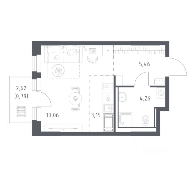 В продаже студия в корпусе 35.1 ЖК 'Новое Колпино'. Квартира располагается на 5 этаже, общая площадь 25.96 м2.