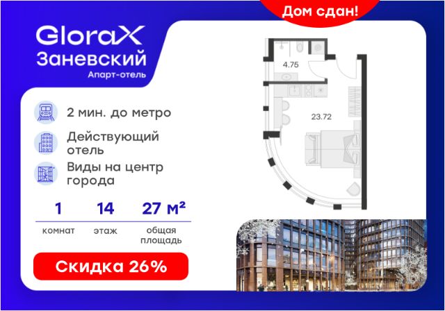 Продается апартамент-студия на 2-м этаже в сданном Апарт-комплексе бизнес-класса "GloraX Заневский". Ключи сразу! Общая площадь лота составляет 29,58 кв. м, из которых 24,32 кв. м отведено под жилую. Номер апартамента - 224. Преимущества: - Полная чистовая отделка - Возможность покупки меблировка и техника - Вход по ключ-карте - Прачечная на 1 этаже - Возможность дозаказа отельного сервиса - Программы доходности - Летний бар и променад - Воркаут площадка - Pet-friendly Апартаменты "GloraX Заневский" - проект бизнес-класса с развитой инфраструктурой, удовлетворяющей все потребности самых взыскательных гостей. Располагается в одном из наиболее перспективных, районов Петербурга в 2х минутах от метро "Ладожская" и в 10 минутах от Невского проспекта. В "GloraX Заневский" есть все, что необходимо для комфортной жизни, работы и отдыха. Инфраструктура, покрывающая все потребности и ожидания собственников и арендаторов. В радиусе 150 метров находятся супермаркеты с возможностью доставки продуктов прямо до дверей апартаментов. На 1000 кв. м. общественных пространств расположится уютный лобби-бар, ресторан мировой кухни на 80 человек и оборудованные коворкинги. В апартаментах "GloraX Заневский" выполнена современная отделка с использованием высококачественных экологичных материалов. В проекте предусмотрен подземный отапливаемый паркинг на 100 мест, куда можно спуститься на лифте прямо от дверей апартаментов. Узнайте подробности в Отделе продаж. Купить квартиру-студию с отделкой от застройщика рядом с метро Новочеркасская.