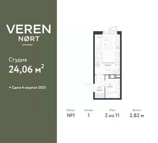 Успейте оформить бронирование по этой цене! Предложение ограничено! Стоимость квартиры указана со скидкой, ваша экономия составит 644,146 RUB. По всем вопросам звоните в офис продаж, мы вам все подробно расскажем! Продается 1-комн. квартира-студия от застройщика в Veren Nort Сертолово на 2 этаже. Квартира без отделки, после оформления собственности можно делать ремонт. Общая площадь: 24.06 кв.м., площадь гостиной 15.82 кв.м., из которых 5 кв.м. выделено под кухонную зону. Все окна выходят на одну сторону. В квартире один совмещенный санузел. Высота потолков 2.82 м. Квартира находится в корпусе 1. Дом монолитный, одноподъездный, высотой 11 этажей. На этаже 14 квартир. В подъезде 2 грузовых лифта. Начало строительства - 3 квартал 2023 года. Окончание строительства - 4 квартал 2025 года. Оформление сделки по договору долевого участия. Вид на приватный двор. Сочетание современной архитектуры и отличной экологии севера Лен. области. Выразительный облик домов разработан именитым архитектурным бюро "Остоженка". Характеристики жилого комплекса исключительны: продуманный ландшафтный дизайн, оригинальные парадные, разработанные по индивидуальному дизайн-проекту, современные детские и многофункциональные спортивные площадки, летний кинотеатр под открытым небом, два детских сада. Комплекс создается в уже сложившейся инфраструктуре г. Сертолово и обладает удобным транспортным сообщением с Санкт-Петербургом. В 300 метрах от "VEREN NORT сертолово" планируется транспортно-пересадочный узел "Сертолово", который обеспечит удобную железнодорожную связь с Финляндским вокзалом Санкт-Петербурга. #zUDVCC Квартира-студия с отделкой от застройщика рядом с метро Озерки.