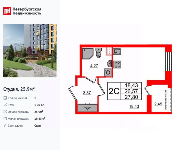 ЙЕС Приморский — многофункциональный комплекс апартаментов с разнообразной сервисной инфраструктурой для комфортной жизни и успешного бизнеса. Комплекс расположится в Приморском районе Санкт-Петербурга в десяти минутах ходьбы от станции метро "Комендантский проспект". В 12-этажном здании размещено 860 эргономичных и стильных апартаментов различных категорий, а также коммерческие помещения. Особенностью проекта является наличие уникальных двухэтажных апартаментов категории Пентхаус с террасами и панорамными окнами, из которых открывается великолепный вид на город. Продам квартиру-студию с отделкой от застройщика в районе Приморский в Санкт-Петербурге.