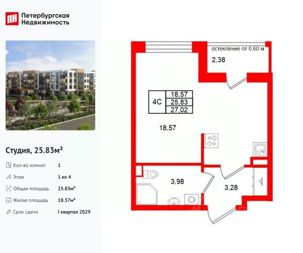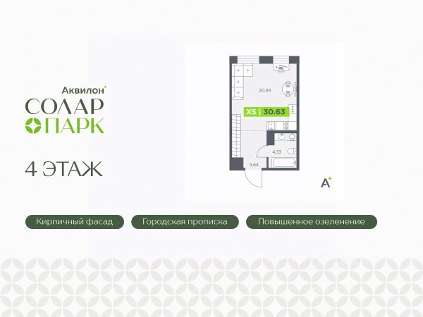 Продается 1-комн. квартира-студия с предчистовой отделкой в ЖК "Аквилон Солар" на 2 этаже. Общая площадь: 28.57 кв.м., площадь гостиной 17.76 кв.м., из которых 5.29 кв.м. выделено под кухонную зону. Все окна выходят на одну сторону. В квартире одна лоджия, один совмещенный санузел. Высота потолков 2.7 м.