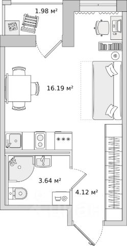 Комната 18.92 кв. м. , прихожая 3.04 кв. м. , санузел 3 кв. м.,