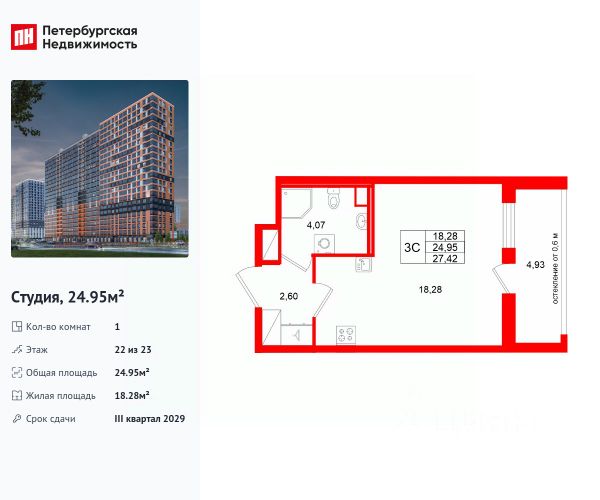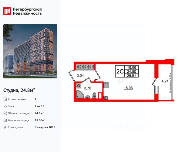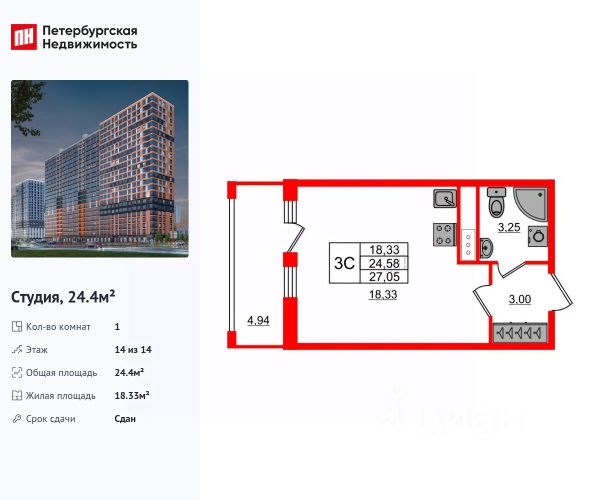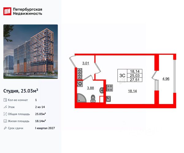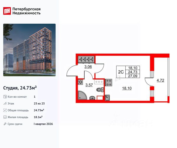 Общая площадь квартиры - 24.96 кв. м. , высота потолка 2,77 м.