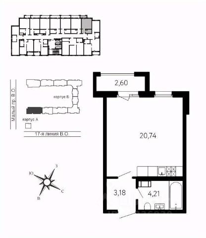 Однокомнатная квартира-студия с предчистовой отделкой в ЖК "Новая Земля" на 3 этаже. Общая площадь: 20.77 кв.м., площадь гостиной 16.11 кв.м., из которых 6.41 кв.м. выделено под кухонную зону. Все окна выходят на одну сторону. В квартире один совмещенный санузел. Высота потолков 2.85 м. Квартира находится в корпусе 1.7. Дом монолитный, одноподъездный, высотой 22 этажа. На этаже 9 квартир. В подъезде 2 пассажирских и 1 грузовой лифт. Окончание строительства - 4 квартал 2028 года. Оформление сделки по договору долевого участия. Новая Земля — проект LEGENDA в локации морской набережной Васильевского острова, где уже сегодня формируется многообещающее и перспективное место для жизни и инвестиций. Проект состоит из двух очередей, расположенных в непосредственной близости, но имеющих идеологически разный подход к проектированию и ассортиментному предложению. Первая очередь, где квартиры уже в продаже, наполнена компактными функциональными и эстетичными сьютами в комплектации TechnoBox, подходящими для активной аудитории, предпочитающей больше времени проводить в городе. Транспортная доступность обеспечена благодаря близости выезда на ЗСД, который позволяет быстро добраться как до центра города, так и до других районов Санкт-Петербурга. Архитектурная концепция проекта задает новый стандарт для этой локации. Дизайн фасадов, большие окна без импостов, современные инженерные решения — всё это создаёт атмосферу комфортного и эстетичного пространства, отвечающего самым высоким требованиям. В проекте представлена новая линейка планировочных решений, созданных по принципам отельного проектирования. Сьюты от LEGENDA — это уникальная работа с пространством, сочетающая сверхфункциональность и удобство, чистоту линий и стилистический минимализм. Планировочные решения в рамках первой очереди проекта будут поделены на несколько сегментов, отличающихся размерами, функциональной наполненностью и отвечающих потребностям различных жителей проекта.