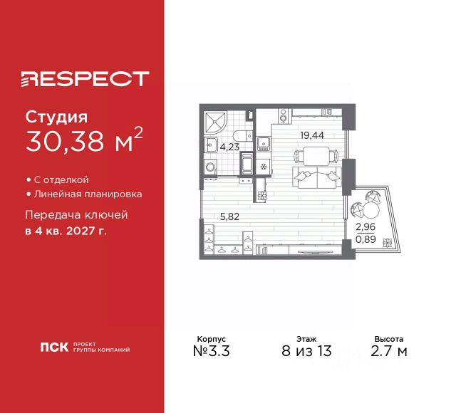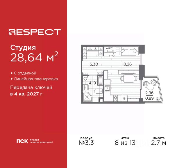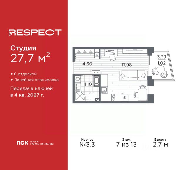 1-комн. квартира-студия с отделкой в ЖК "RESPECT" на 7 этаже. Общая площадь: 27.7 кв.м., площадь гостиной 17.98 кв.м., из которых 5 кв.м. выделено под кухонную зону. Все окна выходят на одну сторону. В квартире один балкон, один совмещенный санузел. Высота потолков 2.7 м.