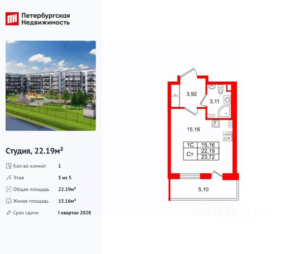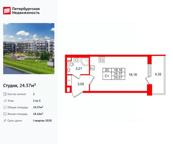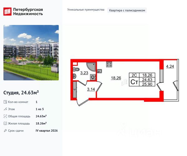 ***Характеристика. Квартира (видовая) светлая (вид на площадки в сторону д/с), с ЭКСКЛЮЗИВНОЙ ОТДЕЛКОЙ и мебелью в с/у от застройщика - 24,35 кв.м (жилая 18,04 кв.м, балкон 5,47 кв.м, с/у 3,28 кв.м, кор. 3,03 кв.м) 4 этаж из 5. Срок сдачи квартиры IV кв. 2026 года,