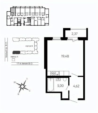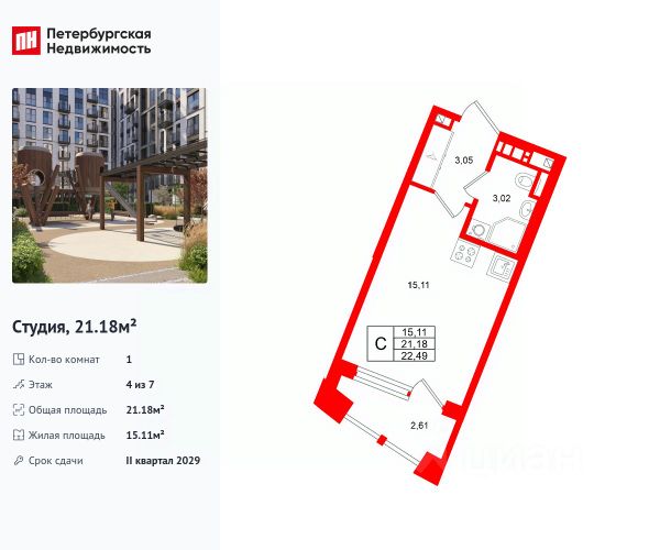 1-комн. квартира-студия с предчистовой отделкой в ЖК "LEGENDA Васильевского" на 7 этаже. Общая площадь: 29.08 кв.м., площадь гостиной 22.2 кв.м., из которых 5 кв.м. выделено под кухонную зону. Все окна выходят на одну сторону. В квартире один балкон, один совмещенный санузел. Высота потолков 2.72 м. "LEGENDA Васильевского" жилой квартал в минутной доступности от Финского залива, главного креативного хаба Санкт-Петербурга Севкабель Порта и других точек притяжения. Современные инженерные и технические решения, повышающие качество жизни TechnoBox включают в себя: стационарный и удаленный контроль дома, систему вентиляции Air Design - здоровое дыхание без лишнего шума, мультисервисную сеть, объединяющую коммуникационные системы, удаленное управление электроприборами, контроль отопления в каждом помещении, поддерживающий оптимальный температурный баланс во время "холодного" периода", датчики протечки, датчик открытия входной двери. Мультисервисная сеть (МСС) объединяет ключевые слаботочные системы дома, задавая им единый высокий стандарт работы, обеспечивая надёжность их функционирования и управления. Квартира готова к декорированию. Застройщиком сделана шумоизоляция; стены подготовлены для отделки; проведена электрика с учетом рекомендаций по расстановке мебели и бытовой техники; выровнен пол. В каждой квартире установлена взломостойкая входная дверь, окна со специальным термоизолированным алюминиевым профилем. Двор жилого комплекса "LEGENDA Васильевского" закрыт. Проект состоит из шести разноформатных корпусов с ритмичными фасадами в духе пост-конструктивизма. Геометрия жилого комплекса состоит из четко простроенных осей, чередующих открытые пространства и объемы корпусов, каждый из которых обладает своим визуальным кодом индивидуальным рисунком фасада и цветовой палитрой. Корпуса образуют периметр с общественными пространствами: площадью с кафе, магазинами и пешеходным променадом с детскими игровыми хабами, местами для спокойного отдыха и workout-зоной. Срок сдачи 4 квартал 2027 года. На территории комплекса предусмотрены теплый подземный паркинг и два наземных 4-х этажных паркинга.