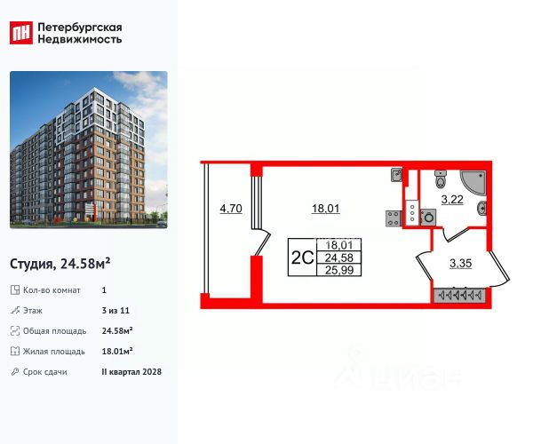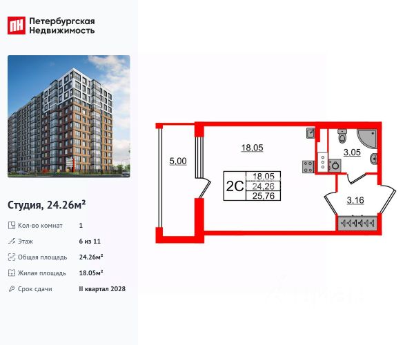 В продаже студия 25.71 метр на 5 этаже из 12.