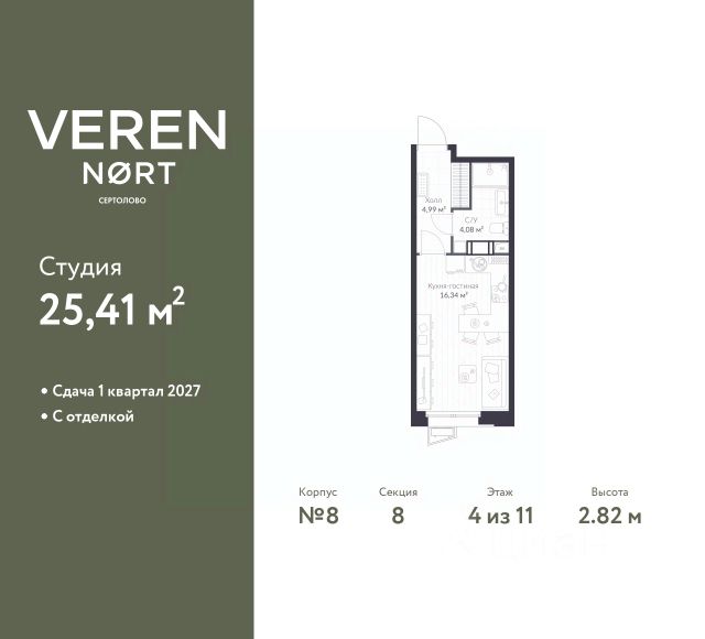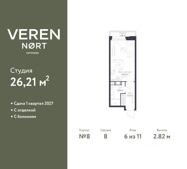 О квартире: площадь 26,9 м², 8 этаж, высота потолка 2,75, на этаже всего 4 квартиры!