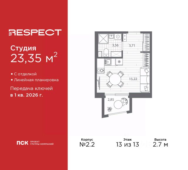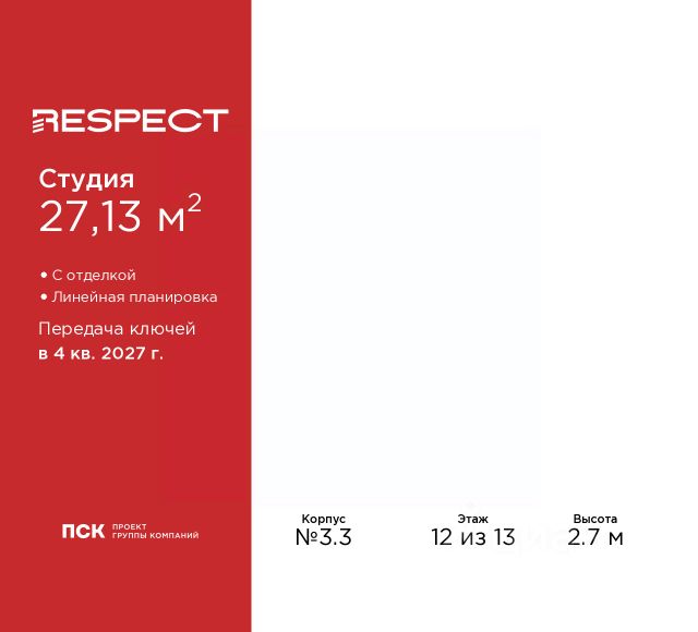 Однокомнатная квартира-студия с отделкой в ЖК "RESPECT" на 12 этаже. Общая площадь: 27.67 кв.м., площадь гостиной 17.98 кв.м., из которых 5 кв.м. выделено под кухонную зону. Все окна выходят на одну сторону. В квартире один балкон, один совмещенный санузел. Высота потолков 2.7 м.