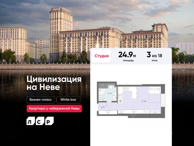 Продаётся студия в ЖК "Цивилизация на Неве" на 3 этаже. Общая площадь составляет 19.65 кв. м. Квартира с white box отделкой. Жилой комплекс "Цивилизация на Неве" располагается по адресу Санкт-Петербург, Невский. "Цивилизация на Неве" - видовые дома бизнес-класса, расположенные вдоль набережной Невы, всего в 7 км от исторического центра. Жилой комплекс идеально выражает особый дух, свойственный знаменитым просторным кварталам постройки сталинской эпохи в Москве и на Московском проспекте в Петербурге. Расположение: • 15 мин на авто до Невского проспекта; • 15 мин на авто до Московского вокзала; • 5 мин на авто до станции метро "Улица Дыбенко"; • 14 мин (7 км) до КАД. Уникальный дизайн входных зон, закрытая территория, видеонаблюдение и охрана, подземный паркинг с лифтом и другие особенности проекта отвечают заявленному классу. В каждом дворе предусмотрено озеленение по индивидуальному ландшафтному проекту с благородными растениями и кустарниками. Преимущества: • Закрытая территория с видеонаблюдением; • Подземный паркинг с лифтом; • Детская площадка на приватной безопасной территории; • Несколько детских садов и школ; • Инфраструктура шаговой доступности на первых этажах корпусов. Успейте приобрести квартиру на выгодных условиях! Чтобы узнать подробности, обращайтесь за консультацией по телефону.