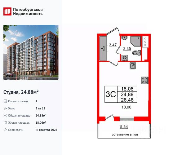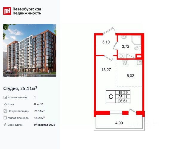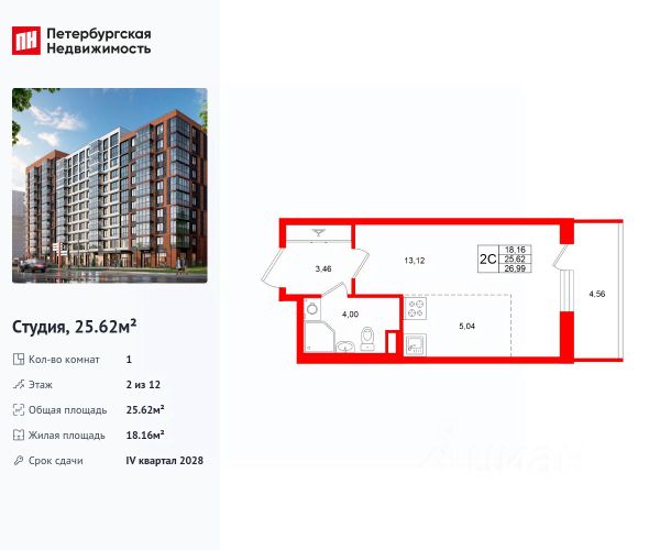 Общая площадь с балконом, составляет 26,98 кв. м.