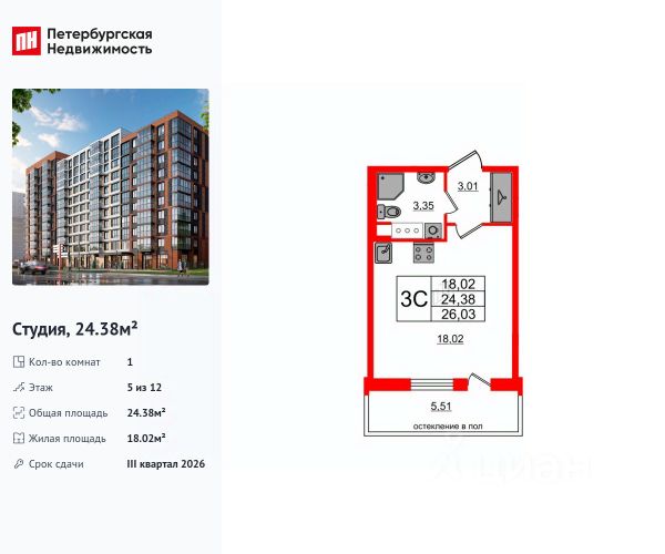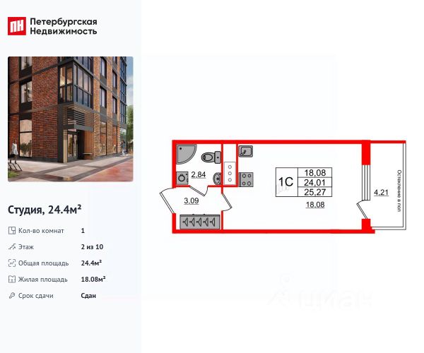 Общая площадь - 24,53 кв. м. (балкон не включён в метраж)