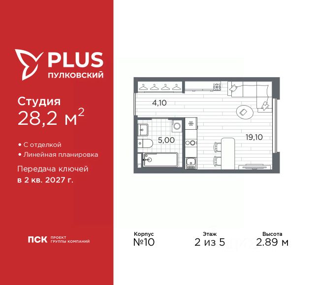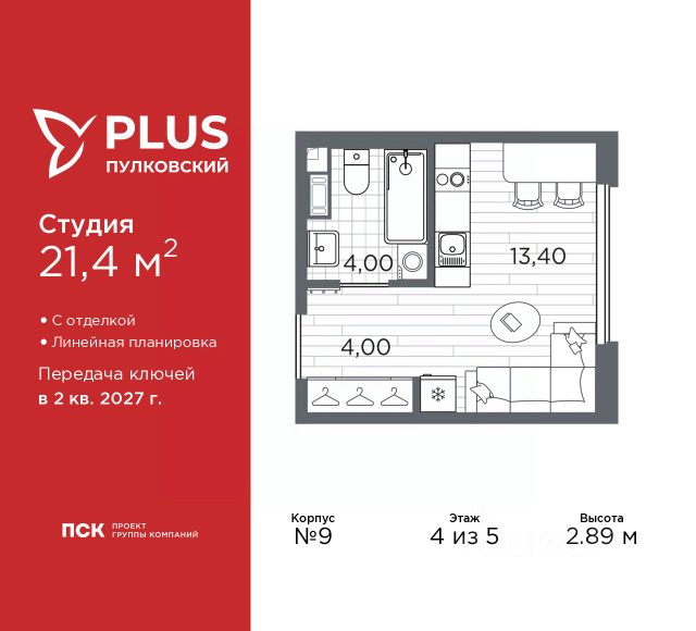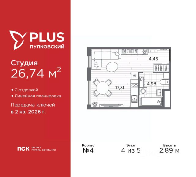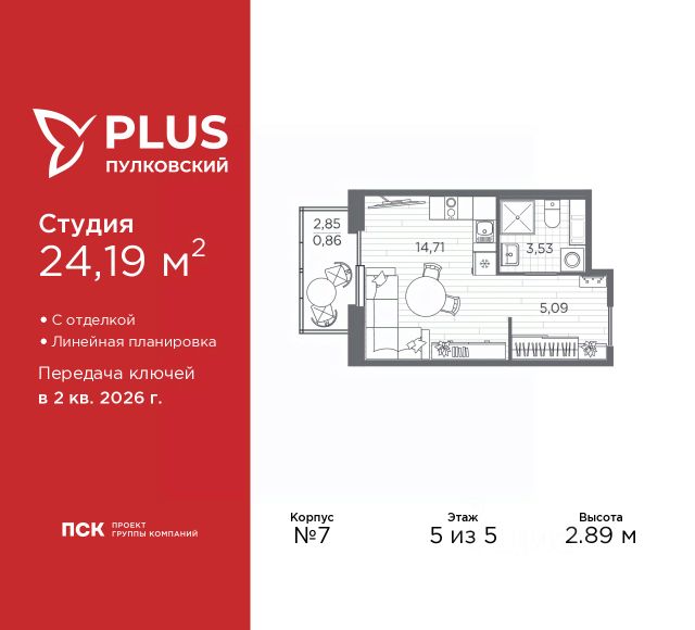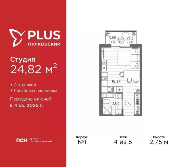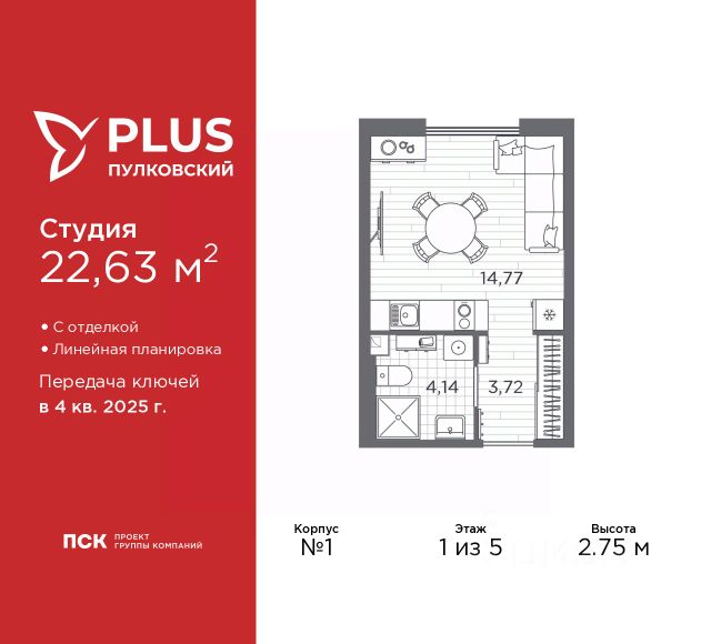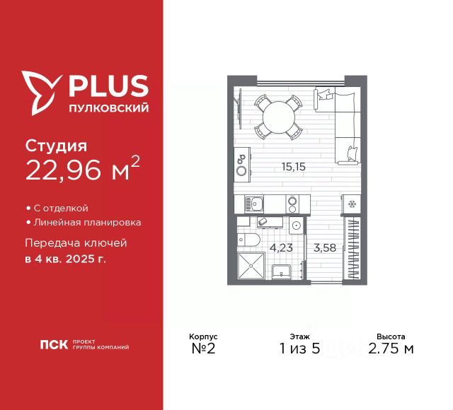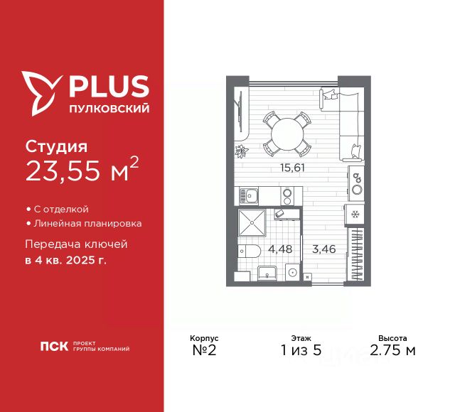 Продается 1-комн. квартира-студия от застройщика с отделкой в ЖК "PLUS Пулковский" на 1 этаже. Общая площадь: 23.55 кв.м., площадь гостиной 15.61 кв.м., из которых 5 кв.м. выделено под кухонную зону. Все окна выходят на одну сторону. В квартире один совмещенный санузел. Высота потолков 2.75 м. Все квартиры в проекте сдаются с полной чистовой отделкой. Выполняется в двух стилистических решениях светлый стиль и темный современный стиль. Вам остается только расставить мебель. Важное преимущества отделки от застройщика в гарантии на все работы и в том, что фактическая стоимость полной отделки распределяется в ипотечных платежах при покупке в ипотеку. Дом монолитный, многоподъездный, высотой 5 этажей. Квартира находится во 2-й секции в корпусе 2. На этаже 9 квартир. В подъезде 1 грузовой лифт. Начало строительства - 4 квартал 2023 года. Окончание строительства - 4 квартал 2025 года. Оформление сделки по договору долевого участия. ЖК "PLUS Пулковский" расположен в престижном Московском районе на пересечении Пулковского и Волхонского шоссе, по которым можно быстро добраться до КАД и до станций метро Московская и Звёздная. Поблизости расположены дворцово-парковые ансамбли Пушкина, Павловска, Петергофа, Гатчины, Ломоносова, а также вся торговая и развлекательная инфраструктура: ТК Лето, Outlet Village Pulkovo, Пулково-3, гипермаркеты Лента, Окей, Metro. На территории комплекса будут построены средняя образовательная школа на 825 мест с двумя бассейнами, 2 детских сада на 220 мест каждый. В детских садах тоже будут бассейны. Кроме этого будет построен медицинский центр для взрослых и детей. Во дворах буду оборудованы спортивные и безопасные детские площадки, на первых этажах домов будут расположены коммерческие помещения. Для автолюбителей будут подземные и наземный паркинги. Для жителей домов будет доступно "приложение жителя", которое предоставит такие возможности: — дистанционное открытие дверей в парадную и на территорию комплекса, — просмотр изображений с видеокамер, — контроль за показаниями счетчиков, — коммуникация с УК. Показания всех счетчиков будут собираться дистанционно. В квартирах будет выполнена коллекторная разводка отопления в стяжке пола от коллекторов в межквартирных коридорах. Застройщик ЖК "PLUS Пулковский" - группа компаний ПСК, которая является одной из ведущих девелоперских компаний Санкт Петербурга. Более 16 лет она возводит в Северной столице качественное жилье премиум, бизнес и комфорт-класса, социальные объекты школы и детские сады, апарт-комплексы и торговые центры и является четырехкратным обладателем золотого знака "Надежный застройщик России". #zsTAoE