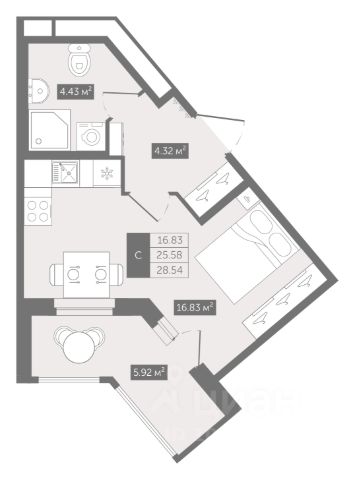 1-комн. квартира-студия с предчистовой отделкой в ЖК "Аквилон RIVA" на 3 этаже. Общая площадь: 31.44 кв.м., площадь гостиной 17.88 кв.м., из которых 5 кв.м. выделено под кухонную зону. Все окна выходят на одну сторону. В квартире один совмещенный санузел. Высота потолков 2.73 м.