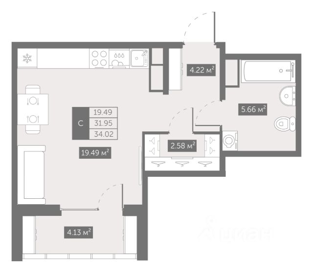 • ✓ Минимальная площадь: 19,2 м² м² (студии и однушки в наличии), максимальная 34,2 м² м².