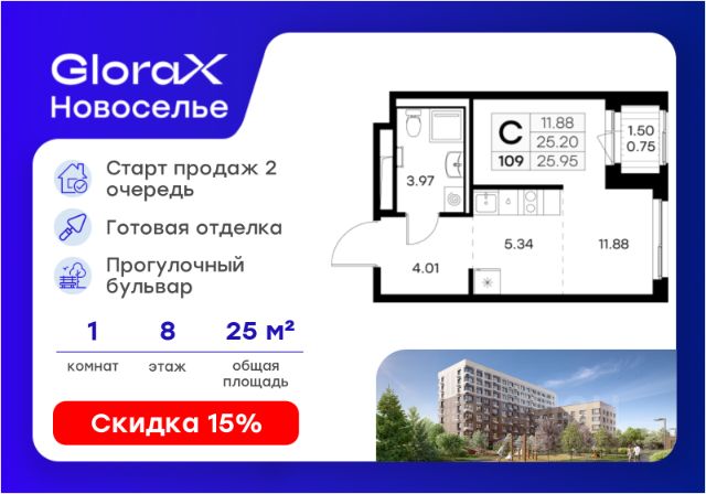 Продается квартира-студия на 2-м этаже в строящемся проекте комфорт-класса GloraX Новоселье. Общая площадь лота составляет 20,83 кв. м, из которых 10,24 кв. м отведено под жилую и 4,40 кв. м под кухонную зону. Номер квартиры - 20 Преимущества квартиры: - Квартиры комфорт-класса - Зеленый район, 5 мин. до Гореловсого лесопарки, 10 мин. до Шунгеровского заказника - 7 мин. до КАД, 16 мин. до ЗСД - 864 м/м на открытой стоянке - Благоустроенный собственный прогулочный бульвар - Закрытые дворы с видеонаблюдением - Детские площадки с геопласткой и бизиборадми - Сад и школа в шаговой доступности - Спортивные площадки и вело-дорожки - Коммерческие помещения на 1 этажах GloraX Новоселье — новый проект комфорт-класса на юго-западной границе Санкт-Петербурга и Ленинградской области. Близость к зеленым зонам Гореловского лесопарка и природного Шунгеровского заказника, а также пешеходный многофункциональный бульвар в центре квартала — идеальное место для тех, кто ценит природу и тишину, при этом не готов отказываться от благ современной инфраструктуры. Застройка осуществляется в рамках единой концепции, предусматривающей не только создание комфортного жилья, но и формирование собственной внутренней благоустроенной среды. Территория каждого двора разделена на зоны отдыха, досуга и игровые площадки с учетом возраста и потребностей детей и взрослых создает неповторимую атмосферу, заряжающую энергией на новые свершения. Это проект, в котором спокойно во всех отношениях. Живите на природе, но с комфортом мегаполиса. Проведите теплые дни в Гореловском лесопарке. Познакомьте детей с историей в Стрельне, Петергофе или Красном селе. Они расположены в 30 минутах от проекта. До ж/д станции "Сергиево" 11 минут на автомобиле, до метро Проспект Ветеранов 20 минут, КАД 7 минут, ЗСД 16 минут. В шаговой доступности остановка общественного транспорта. Рядом с проектом будут построены школа и детский сад. Здесь все создано для максимального комфорта каждого жителя. Приватное пространство внутреннего двора с беседками для работы и отдыха, зеленый двор с уютным многоуровневым освещением, детскими эко-площадками и спортивными workout создает неповторимую атмосферу, заряжающую энергией на новые свершения. Цена указана при 100% оплате или стандартной ипотеке. Узнайте подробности в Отделе продаж. Продам квартиру-студию в новостройке рядом с метро Ленинский проспект.