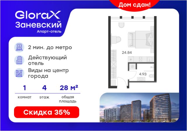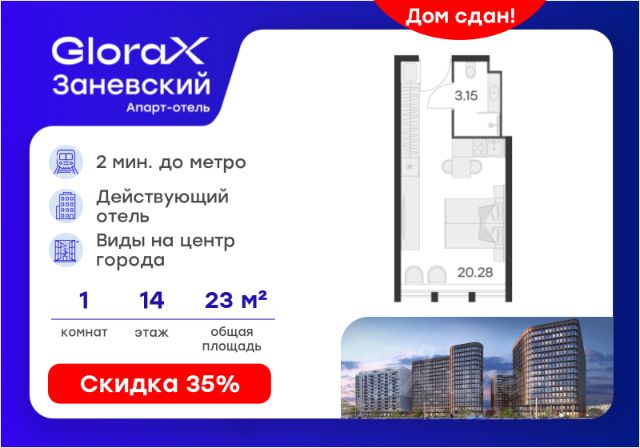 Продается апартамент-студия на 2-м этаже в сданном Апарт-комплексе бизнес-класса "GloraX Заневский". Ключи сразу! Общая площадь лота составляет 39,18 кв. м, из которых 35,85 кв. м отведено под жилую. Номер апартамента - 214. Преимущества: - Полная чистовая отделка - Возможность покупки меблировка и техника - Вход по ключ-карте - Прачечная на 1 этаже - Возможность дозаказа отельного сервиса - Программы доходности - Летний бар и променад - Воркаут площадка - Pet-friendly Апартаменты "GloraX Заневский" - проект бизнес-класса с развитой инфраструктурой, удовлетворяющей все потребности самых взыскательных гостей. Располагается в одном из наиболее перспективных, районов Петербурга в 2х минутах от метро "Ладожская" и в 10 минутах от Невского проспекта. В "GloraX Заневский" есть все, что необходимо для комфортной жизни, работы и отдыха. Инфраструктура, покрывающая все потребности и ожидания собственников и арендаторов. В радиусе 150 метров находятся супермаркеты с возможностью доставки продуктов прямо до дверей апартаментов. На 1000 кв. м. общественных пространств расположится уютный лобби-бар, ресторан мировой кухни на 80 человек и оборудованные коворкинги. В апартаментах "GloraX Заневский" выполнена современная отделка с использованием высококачественных экологичных материалов. В проекте предусмотрен подземный отапливаемый паркинг на 100 мест, куда можно спуститься на лифте прямо от дверей апартаментов. Узнайте подробности в Отделе продаж. Продается квартира-студия в новостройке рядом с метро Площадь Александра Невского.