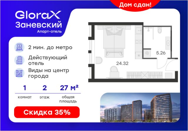 Продается апартамент-студия на 2-м этаже в сданном Апарт-комплексе бизнес-класса "GloraX Заневский". Ключи сразу! Общая площадь лота составляет 39,18 кв. м, из которых 35,85 кв. м отведено под жилую. Номер апартамента - 214. Преимущества: - Полная чистовая отделка - Возможность покупки меблировка и техника - Вход по ключ-карте - Прачечная на 1 этаже - Возможность дозаказа отельного сервиса - Программы доходности - Летний бар и променад - Воркаут площадка - Pet-friendly Апартаменты "GloraX Заневский" - проект бизнес-класса с развитой инфраструктурой, удовлетворяющей все потребности самых взыскательных гостей. Располагается в одном из наиболее перспективных, районов Петербурга в 2х минутах от метро "Ладожская" и в 10 минутах от Невского проспекта. В "GloraX Заневский" есть все, что необходимо для комфортной жизни, работы и отдыха. Инфраструктура, покрывающая все потребности и ожидания собственников и арендаторов. В радиусе 150 метров находятся супермаркеты с возможностью доставки продуктов прямо до дверей апартаментов. На 1000 кв. м. общественных пространств расположится уютный лобби-бар, ресторан мировой кухни на 80 человек и оборудованные коворкинги. В апартаментах "GloraX Заневский" выполнена современная отделка с использованием высококачественных экологичных материалов. В проекте предусмотрен подземный отапливаемый паркинг на 100 мест, куда можно спуститься на лифте прямо от дверей апартаментов. Узнайте подробности в Отделе продаж. Продается квартира-студия в новостройке рядом с метро Площадь Александра Невского.