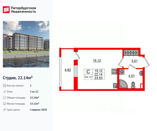 Цена со скидкой до 30% в прямой продаже от застройщика — только в этом месяце. На апартаменты действует беспроцентная рассрочка. Роскошные виды на Неву. Апартамент-студия в комплексе класса бизнес-лайт Зум на Неве на 2-м этаже. Общая площадь 30,1. Предчистовая отделка. Зум на Неве расположен в новом месте силы рядом с центром города на первой линии Октябрьской набережной в Невском районе, всего в 7 км от исторической части Санкт-Петербурга. Большой выбор эргономичных и максимально продуманных планировок позволит каждому найти вариант по душе. Панорамные виды на Неву, благоустроенные дворы, детская игровая комната, подземный паркинг, коммерческие зоны на первом этаже, это и многое другое делает Зум на Неве идеальным местом для жизни. Особенности: - Панорамные виды на Неву и город; - 10 мин. до Парка Строителей, 15 мин. до Лондон-молла, Ленты, Максидома, 15 мин. до метро "ул. Дыбенко", 12 мин. до КАД, 10 мин. до центра; - Единая архитектурная концепция. Сдержанные и монументальные фасады в неоклассическом стиле; - Парадный лобби для жильцов. Единый вход в комплекс с администратором, зоной ресепшн и охраной, зоной для бесконтактной доставки посылок и еды; - Подземный отапливаемый паркинг с доступом из парадной; - Доступно 3 варианта отделки на выбор: черновая, предчистовая (White Box) и чистовая; - Зоны отдыха для взрослых и детей, Wi-Fi-покрытие во дворе и в паркинге, зоны для питомцев, арт-объекты и много другое. В шаговой доступности вся необходимая инфраструктура от детских садов и школ до супермаркетов и салонов красоты; - Все происходящее контролируется видеокамерами, а покой внутренней территории и безопасность ваших детей гарантируется полным отсутствием транспорта во дворах в концепции "без машин". Продается квартира-студия в новостройке в округе Невский в Санкт-Петербурге.