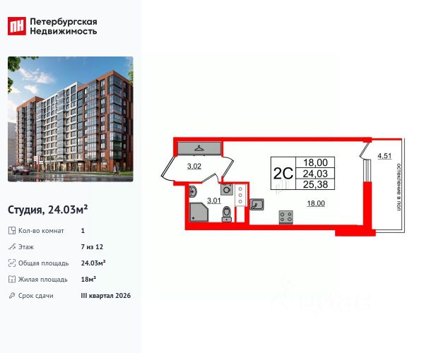 Общая площадь - 24,53 кв. м. (балкон не включён в метраж)