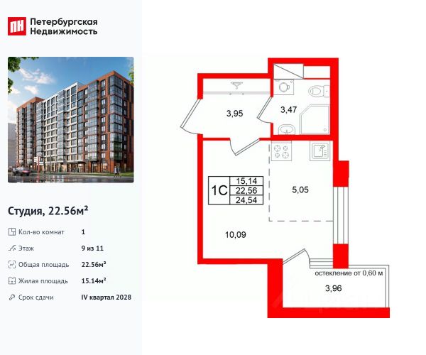 Общая площадь с балконом, составляет 26,98 кв. м.